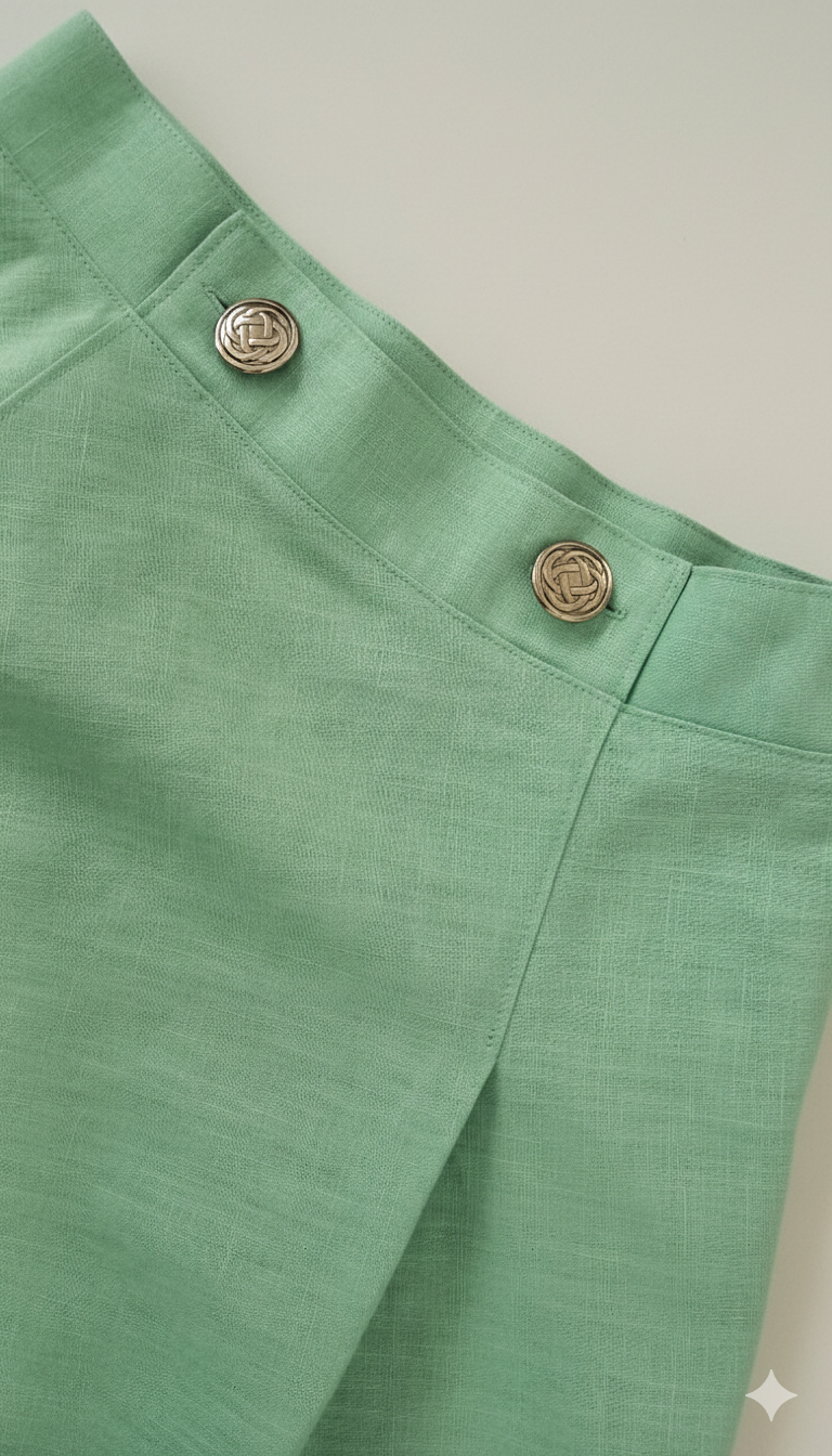 Midi sukně do pasu z lehounkého lnu. Pas zdobí knoflíky s funkční dírkou a na předním díle jsou dva záhyby. Zadní díl je hladký. Střih velmi lichotí postavě a dokáže zakrýt nedostatky.