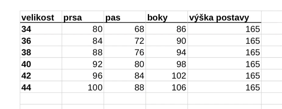 Varianty velikostí: 34, 36, 38, 40, 42, 44.